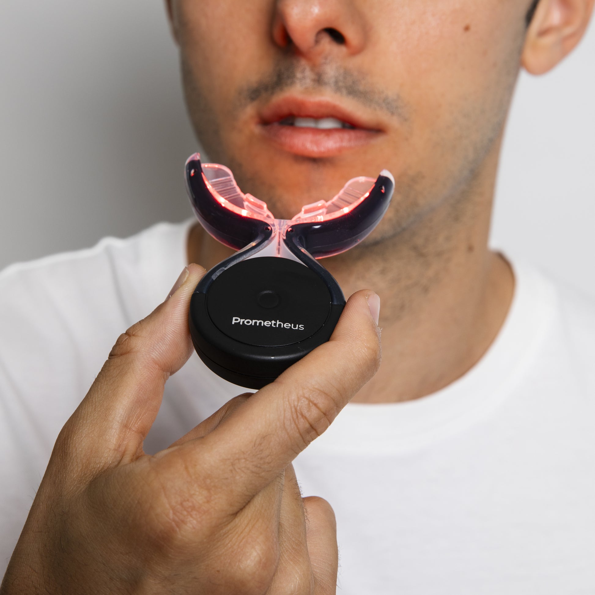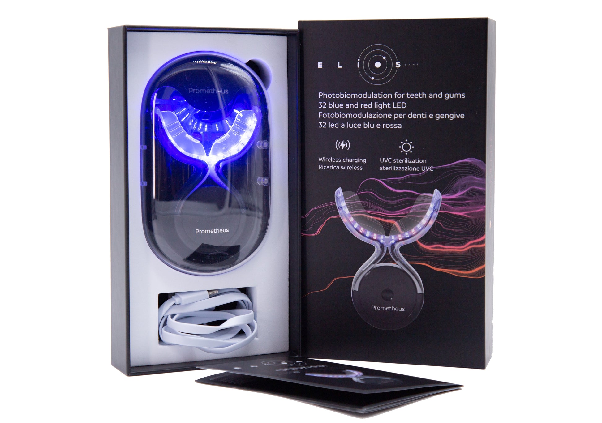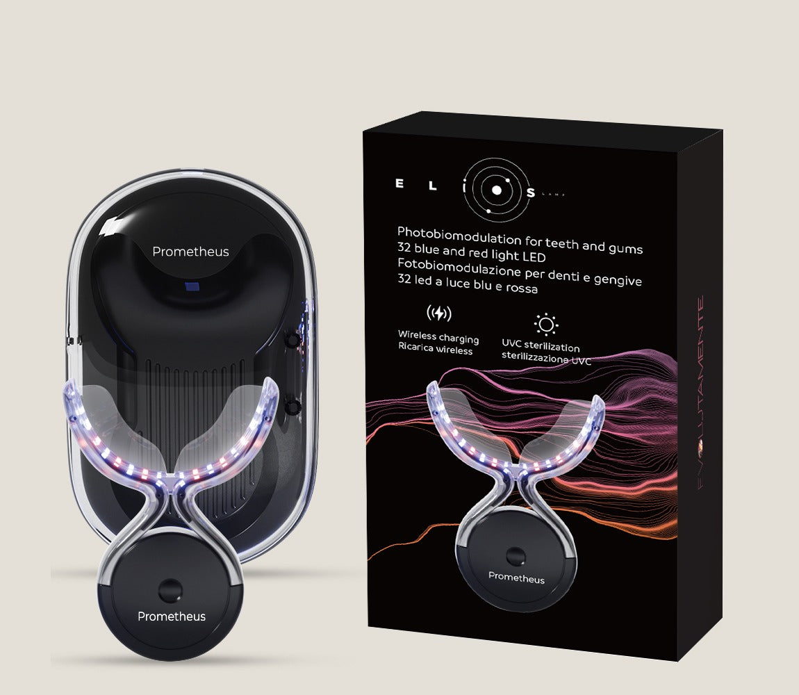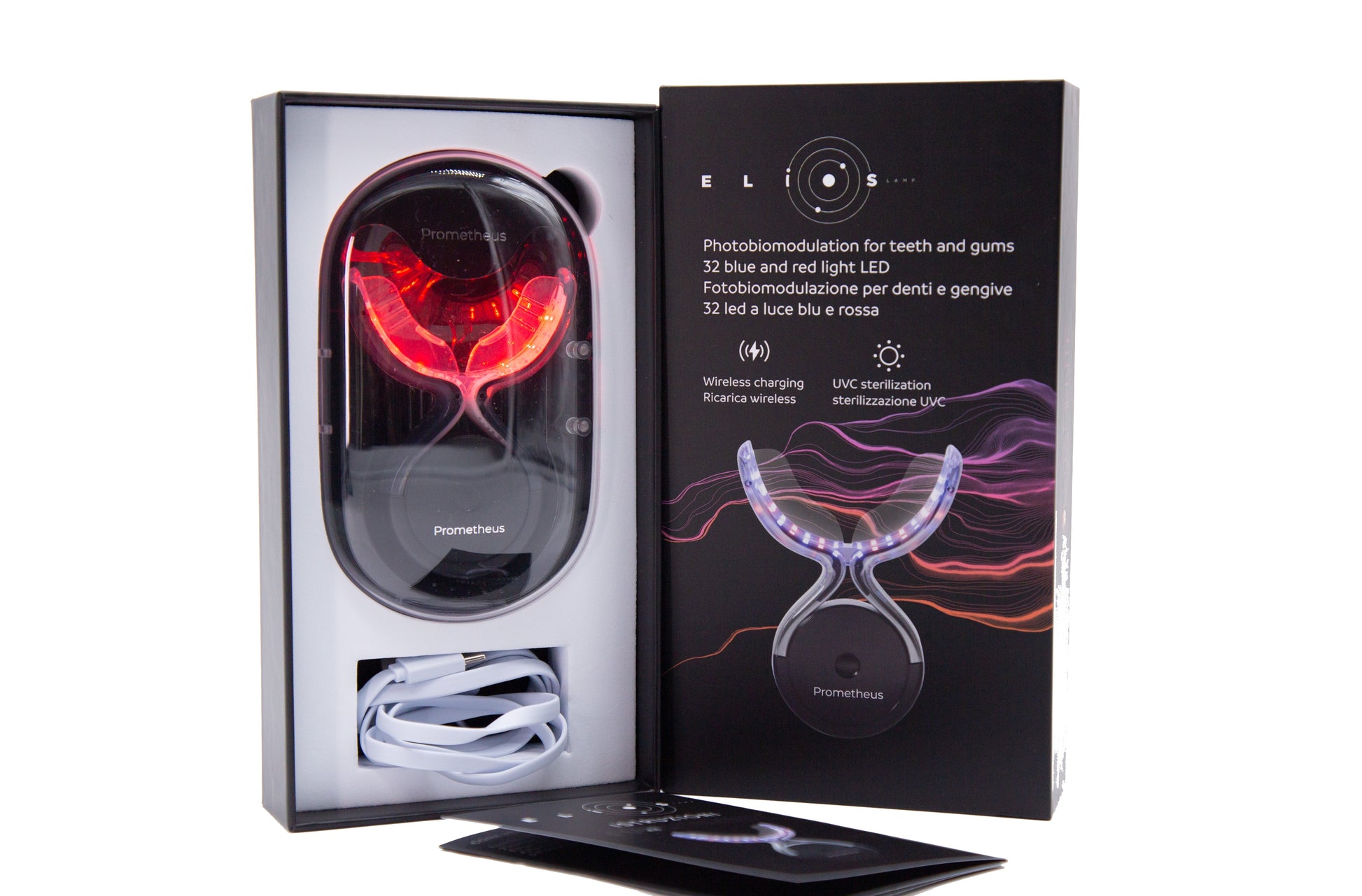 Equipped with 32 LEDs, Prometeo 3.0 combines 20 blue-light LEDs to control the oral microbiome and whiten teeth, with 12 red-light LEDs to reduce inflammation and promote gum tissue regeneration.